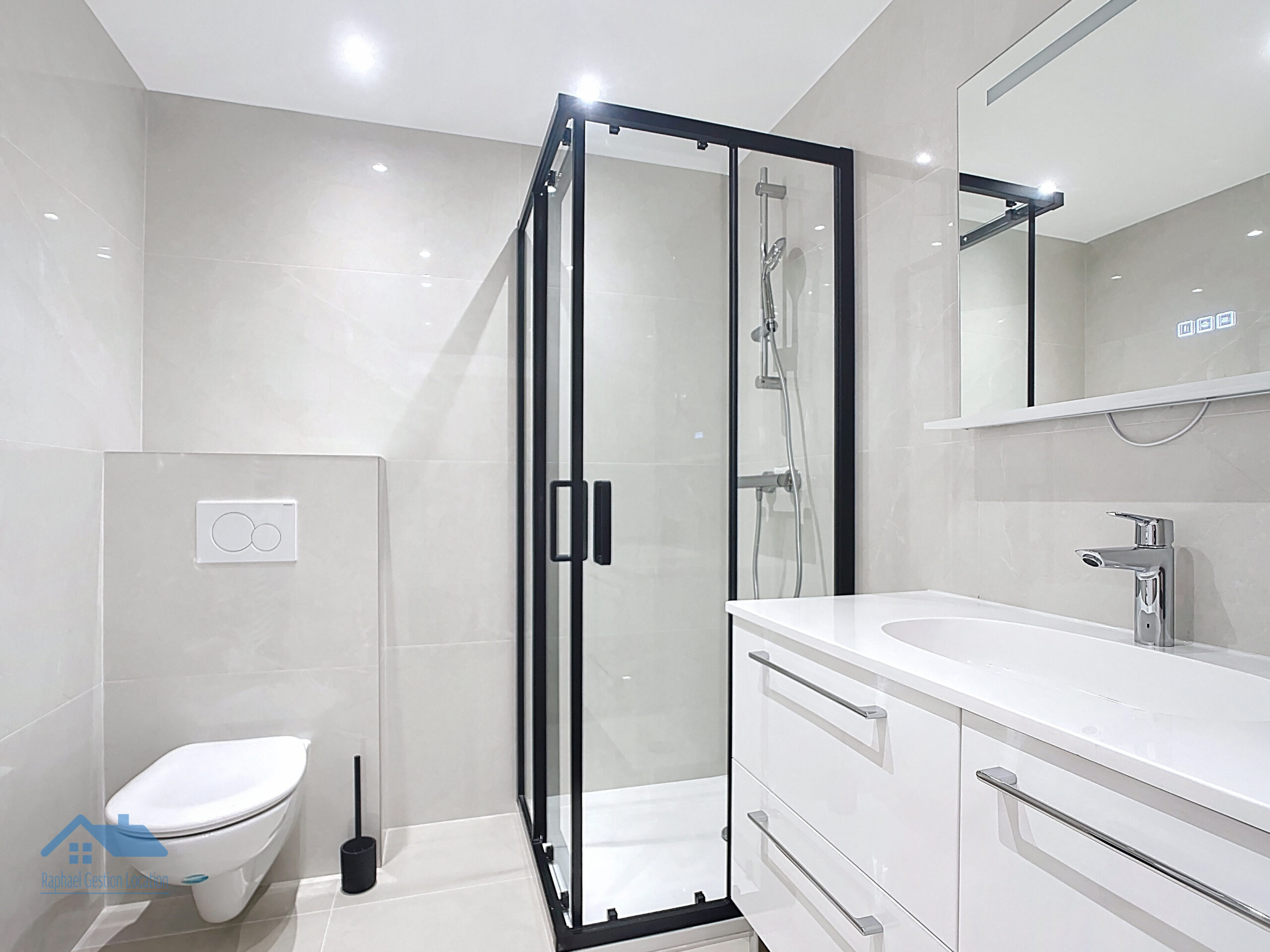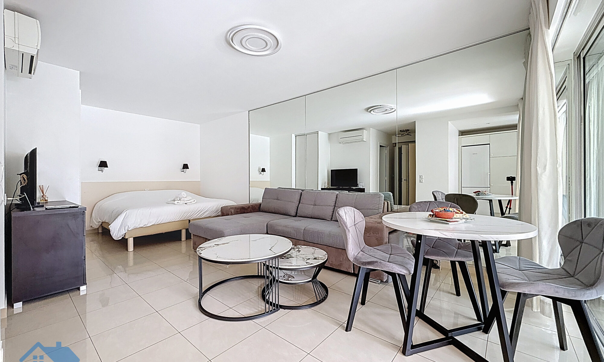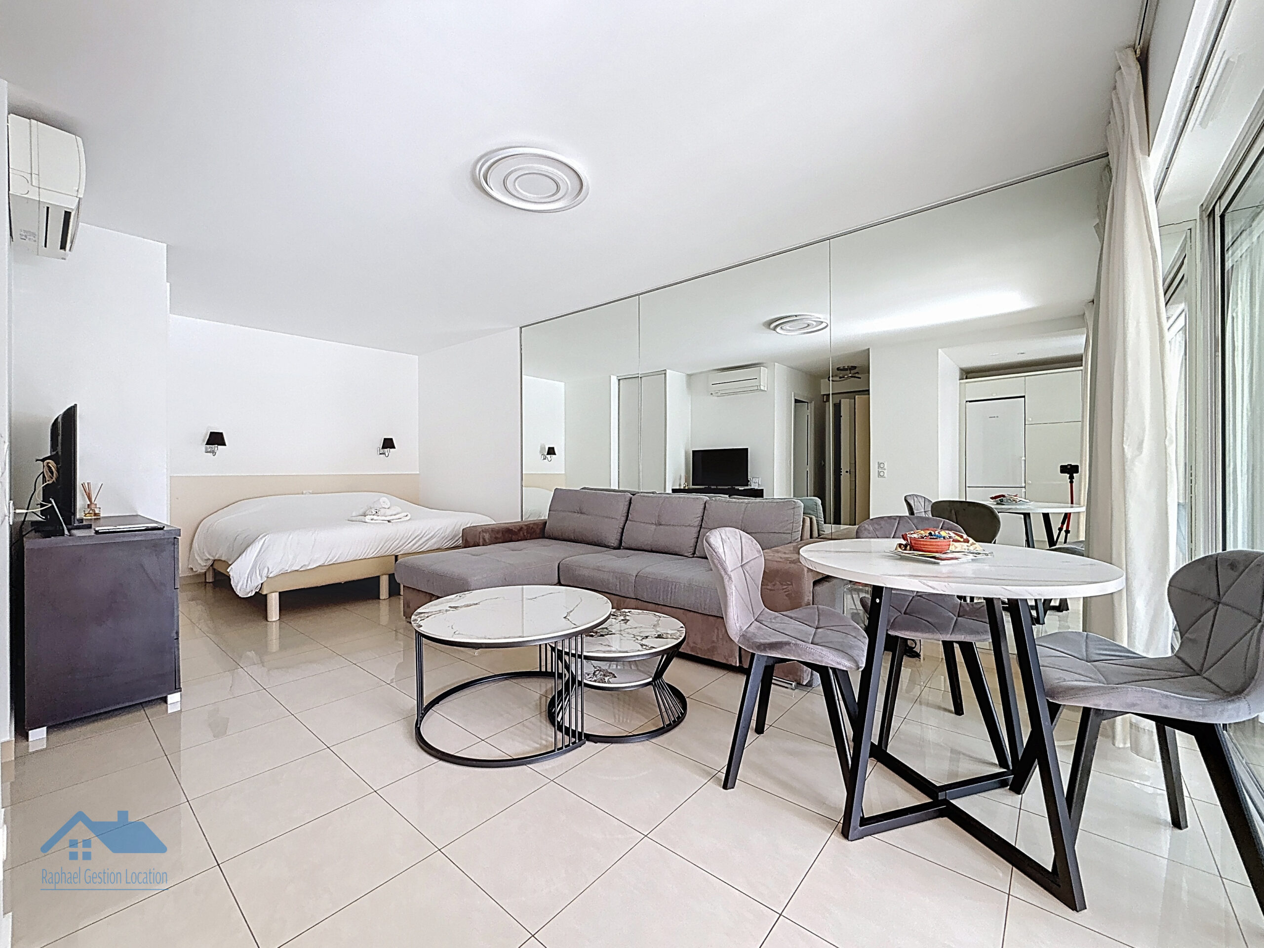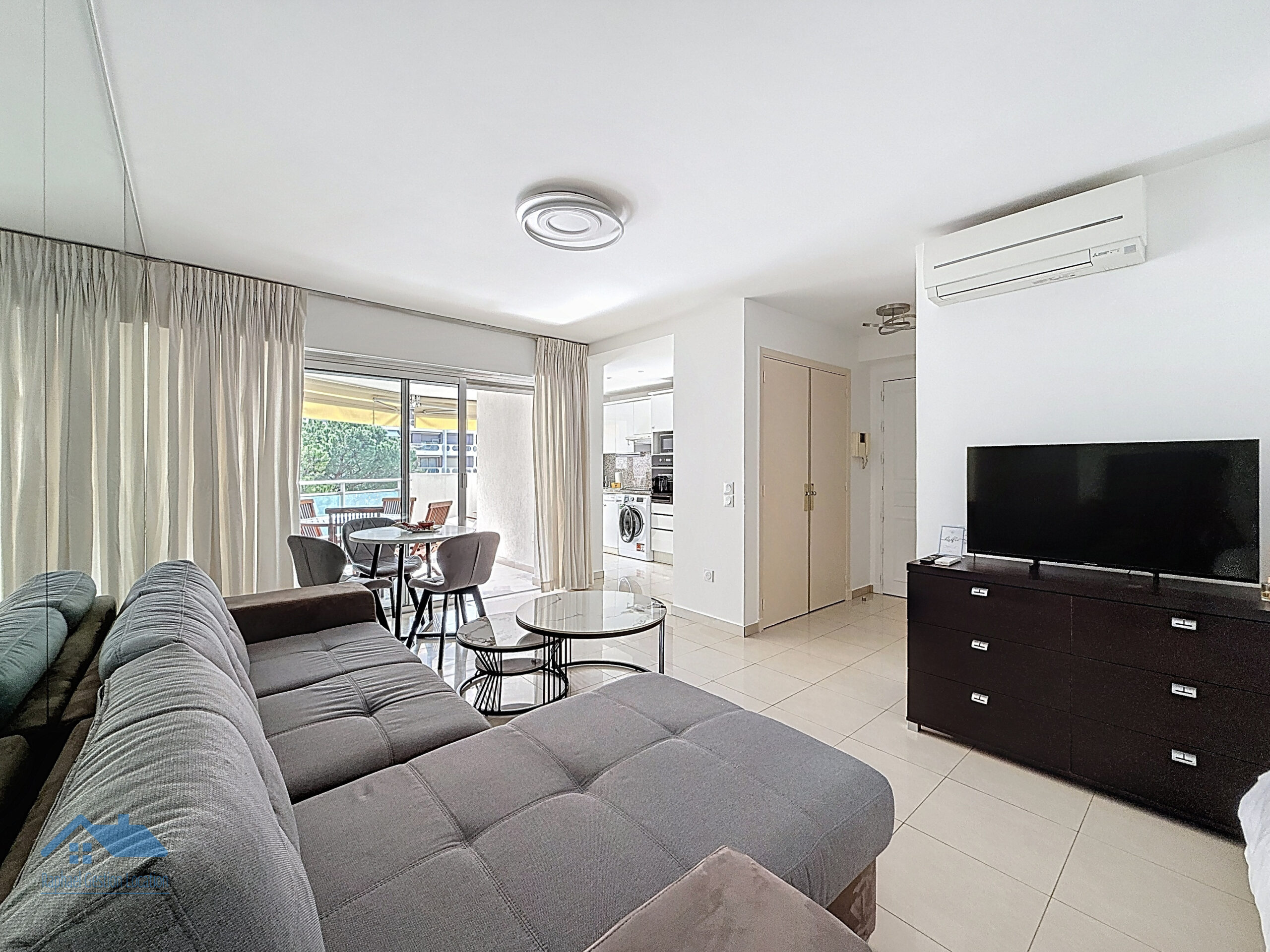 Large terrasse Sud-Est donnant sur un parc paysagé dans une très belle résidence entre les palaces Marriott et Carlton à 8 mn à pied du Palais des Festivals.